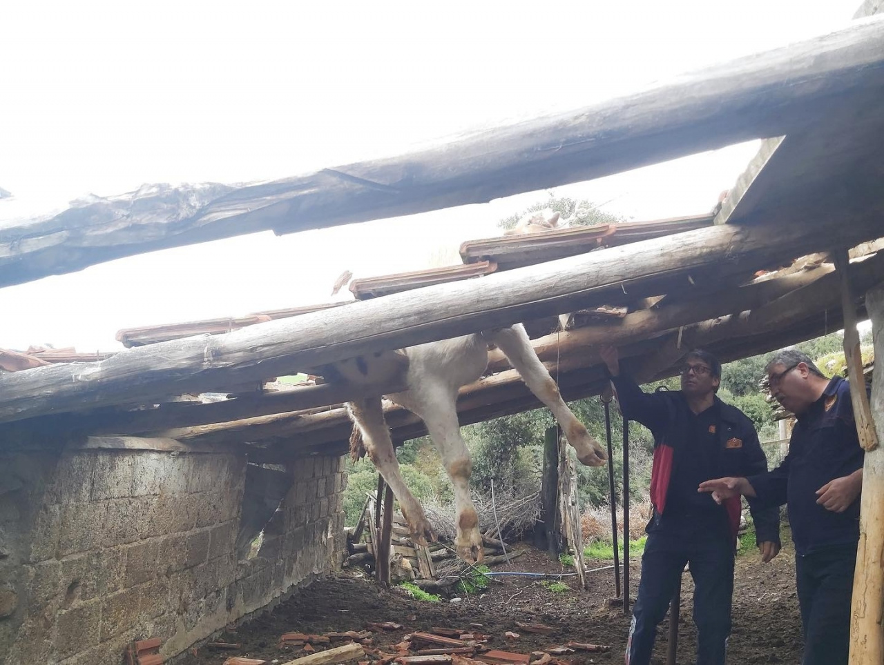 Çatının üzerindeki kiremitlerin çökmesi sonucu inek, mahsur kaldı.