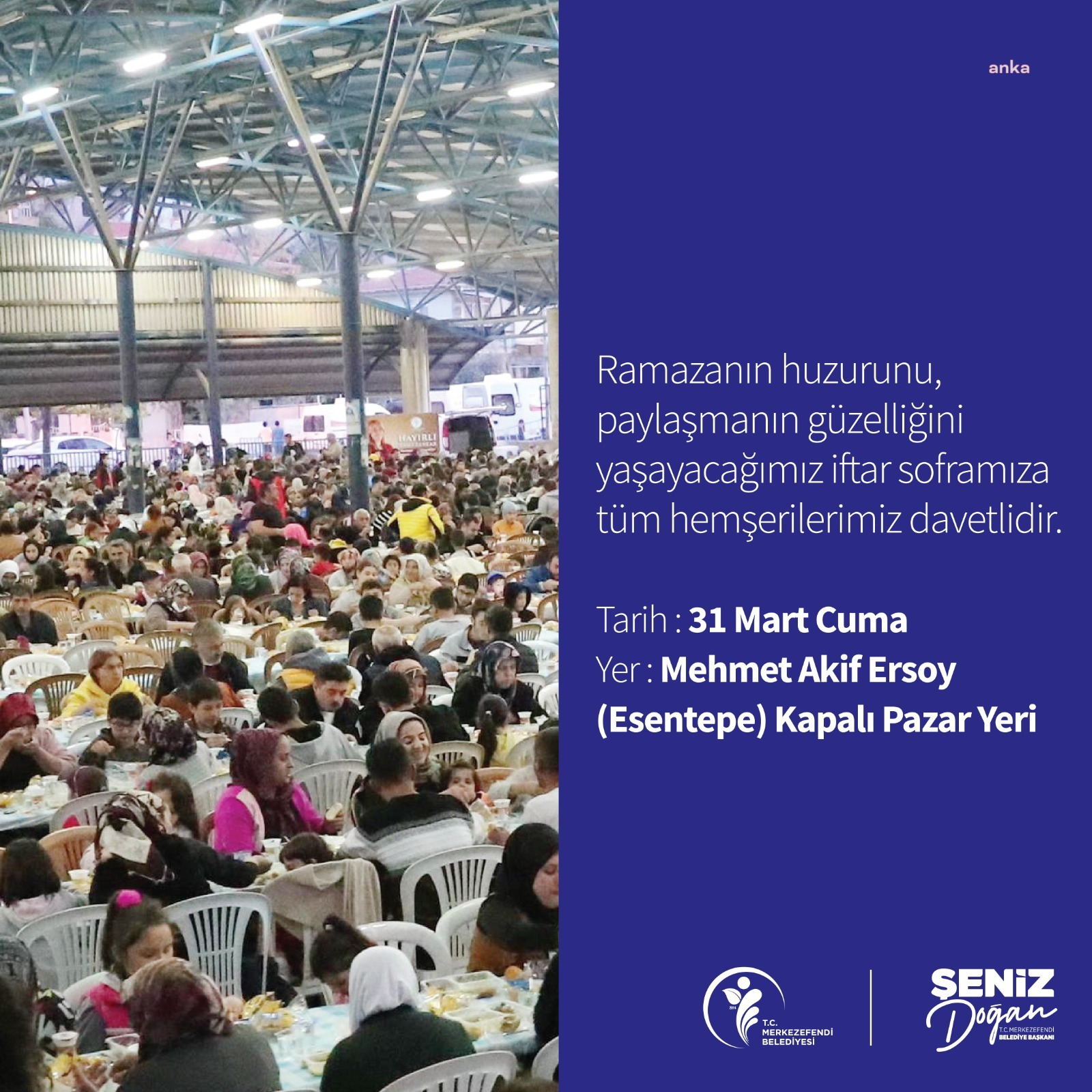 Merkezefendi Belediyesi’nin geleneksel olarak düzenlediği mahallede iftar yemekleri devam ediyor. Ramazan ayının ilk grup iftarını Al-Bada semtinde gerçekleştiren Markizfendi Belediyesi, bu kez Mehmet Akif Ersoy semtinde iftar verecek. İftar 31 Mart Cuma günü Esentepe Kapalıçarşı’da gerçekleşecek. İftar programının ardından tasavvuf dinletisi ve derviş dinletisi yer alacak.
