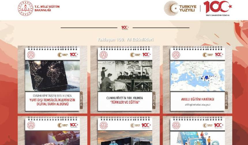 Bakanlık tarafından yapılan açıklamaya göre; Cumhuriyet’in 100’üncü yıl kutlamaları kapsamında yıl boyunca gerçekleştirilecek etkinliklerin kamuoyuna duyurulması ve görünürlüğünün arttırılması amacıyla oluşturulan ‘yuzuncuyil.meb.gov.tr’ web sitesi kullanıma sunuldu. Bu internet sitesinde, Cumhuriyet’in kazanımlarının gelecek nesillere aktarılması için planlanan etkinlikler, yarışmalar, sempozyumlar, çalıştaylar, sanatsal ve kültürel faaliyetlerin takvimi yer alıyor.