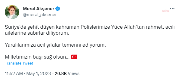 İYİ Parti Genel Başkanı Meral Akşener, Suriye’de meydana gelen patlamada şehit olan polisler için taziye telgrafı yayınladı. Akchner, Twitter hesabından yaptığı paylaşımda, “Suriye’de şehit olan kahraman polislerimize Yüce Allah’tan rahmet, kederli ailelerine sabırlar diliyorum. Yaralılarımıza acil şifalar diliyorum. Milletimizin başı sağolsun…”