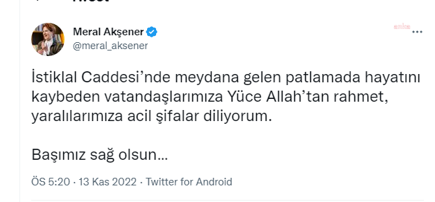 İYİ Parti Genel Başkanı Meral Akşener, İstanbul’daki patlamayla ilgili olarak, “İstiklal Caddesi’ndeki patlamada hayatını kaybeden hemşerilerimize Allah’tan rahmet, yaralılarımıza acil şifalar diliyorum. Başsağlığı diliyoruz.”