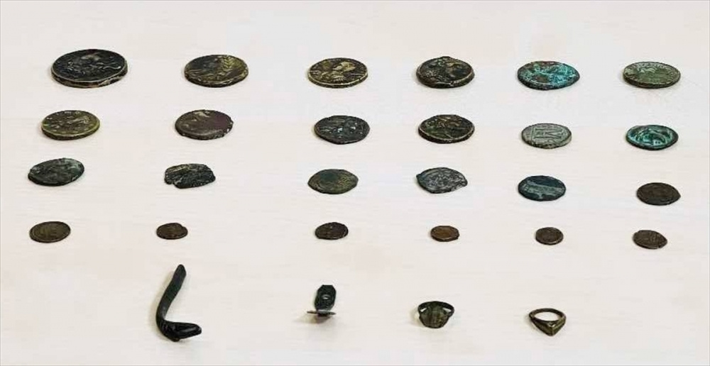Takibe alınan şüpheliler, operasyonla yakalandı. Zanlıların aracında, ikisi yüzük 4 obje ve 24 bronz sikke ele geçirildi.