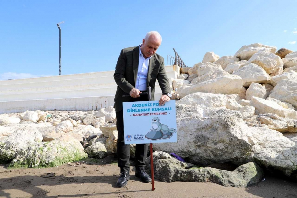Akdeniz Belediye Başkanı Mustafa Gültak ve beraberindekiler, fokların dinlenme alanı olan milli parkın kumlarına “Akdeniz Foku Plajı, Rahatsız Etmeyin” yazılı tabelalar dikti.