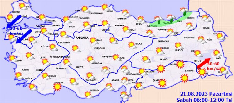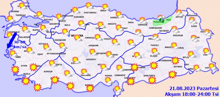 Rapora göre Türkiye’nin kuzeydoğu kesimleri ile Ege ve Akdeniz’in iç kesimlerinin parçalı, yer yer çok bulutlu, Doğu Karadeniz kıyıları ve Orta Karadeniz’in doğu kıyıları ile Doğu Anadolu’nun kuzeydoğusunun yerel sağanak ve gök gürültülü sağanak yağışlı, diğer yerlerin az bulutlu ve açık geçeceği tahmin edilirken, genellikle kuzey, yurdun güney ve doğu kesimlerinde güneyli yönlerden hafif, ara sıra orta kuvvette, Marmara’da kuzeydoğu yönlerden kuvvetli (40-60 km/saat) esmesi bekleniyor.