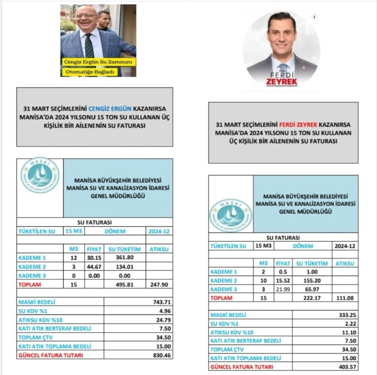 Doğan, Merkez Bankası’nın 2024 yılı enflasyon beklentisini dikkate alarak yaptığı hesaplamayı şöyle açıkladı“Türkiye’nin en pahalı suyunu kullanan Manisa’da 31 Martta yapılacak yerel seçimleri mevcut Büyükşehir Belediye Başkanı Cengiz Ergün kazandığında her ay TÜFE artış oranında su ücretlerine zam yapılacağından üç kişilik bir ailenin ortalama 15 ton su tükettiği dikkate alındığında, 2024 yılsonu Aralık ayı su faturası en iyimser rakamla TCMB’nın 2024 yıl sonu enflasyon beklentisi yüzde 36 artış oranına göre hesaplandığında ÇTV, KDV, Katı Atık Toplama ve Katı Atık Bertaraf ücretleri de dahil olmak üzere toplam 830,56 TL olacak. Seçimi CHP Büyükşehir Adayı Mimar Ferdi Zeyrek kazandığında ise üç kişilik aynı ailenin 15 tonluk su faturası tutarı 403,57 TL olacak.”