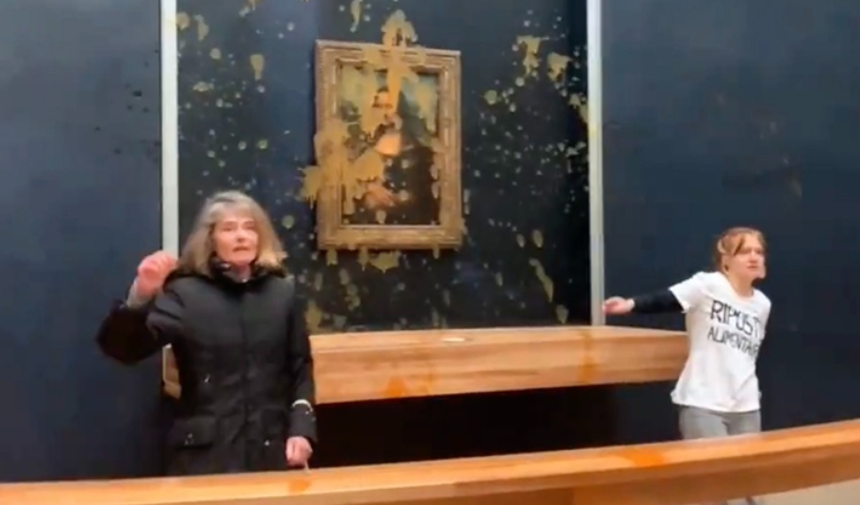 Mona Lisa tablosuna iki protestocu çorba fırlattı. Camla korunan eser zarar görmedi.