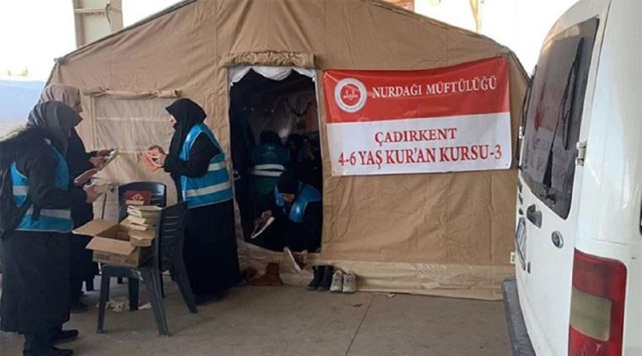 Kahramanmaraş’ta Gaziantep İl Müftülüğünün depremler nedeniyle kurduğu çadır kentte 4-6 yıllık Kur’an-ı Kerim “döngü” açıldı. Eğitim İşleri Başkanı Kazım Özbay, Kur’an-ı Kerim kursunun açılışına yanıt vererek, “Belki de bu çocukların en çok ihtiyacı olan şey, onlara yaklaşmasını bilen insanların olmasıdır. Diyanet bu konuda hiçbir şey söylemiyor.” deprem vergileri nereye gidiyor, yapılmayan işlemler yapılıyor.”