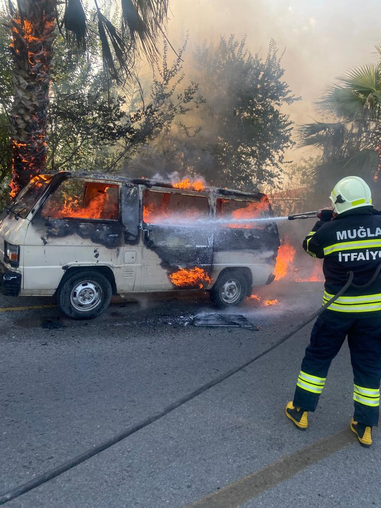Muğla’nın Ortaca ilçesinde park halindeyken alev alan panelvan yanarak kullanılamaz hale geldi, sazlığa da sıçrayan yangın söndürüldü.