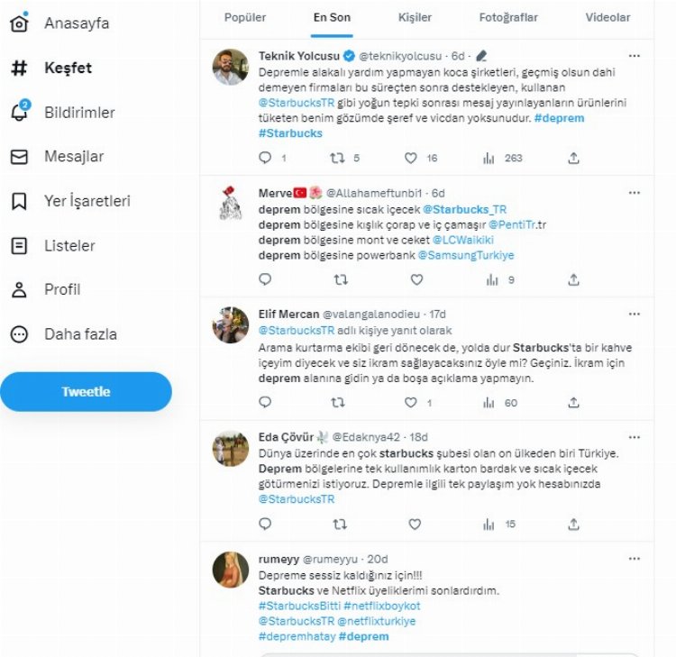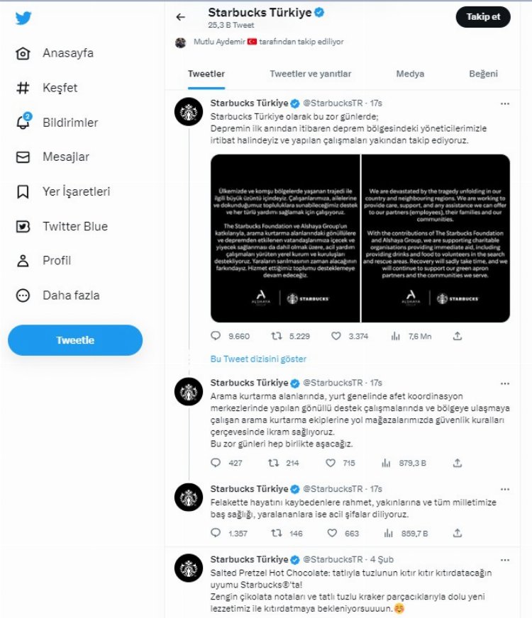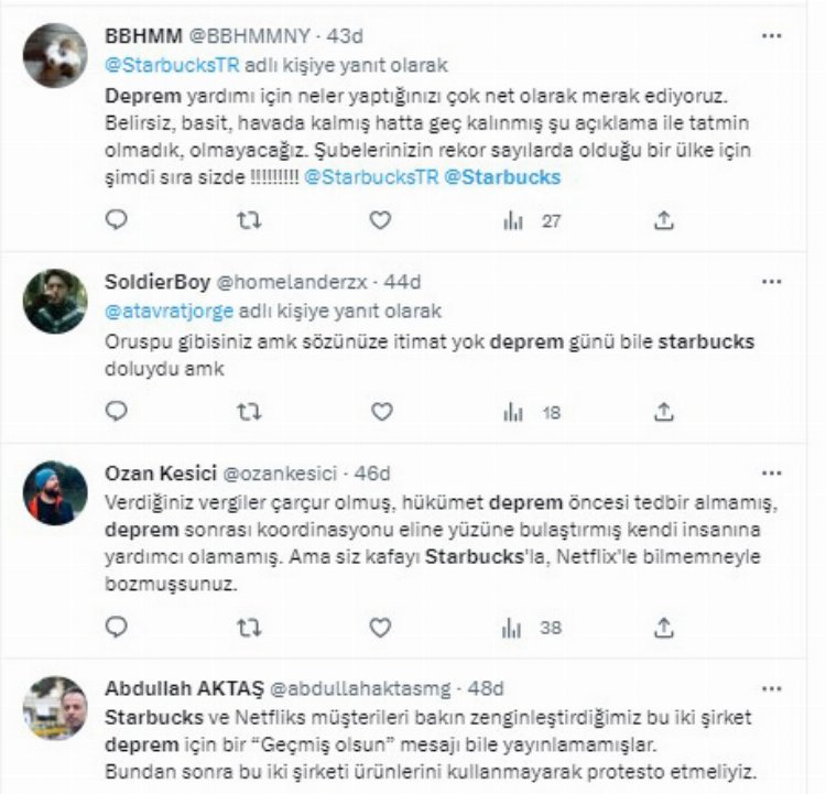“Deprem konusunda yardımcı olmayanların, bu süreçten sonra bile dosyalamayan, destekleyen ve kullanan, @StarbucksTR gibi mesaj atan firmaların ürünlerini tüketmesi nazarımda onursuzluk ve vicdansızlıktır. aşırı bir tepkiden sonra.”