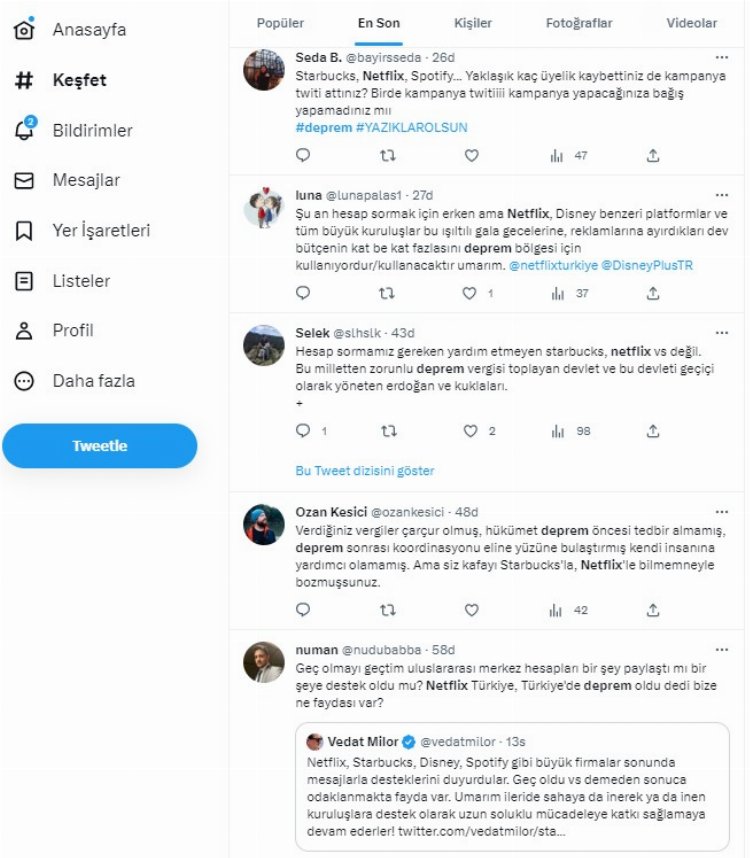 Netflix, Disney ve Starbucks deprem nedeniyle herhangi bir açıklama ya da destek sunmayınca sosyal medyada tepki oluştu. Depremin dördüncü gününde 3 kurumdan peş peşe deprem verileri geldi.