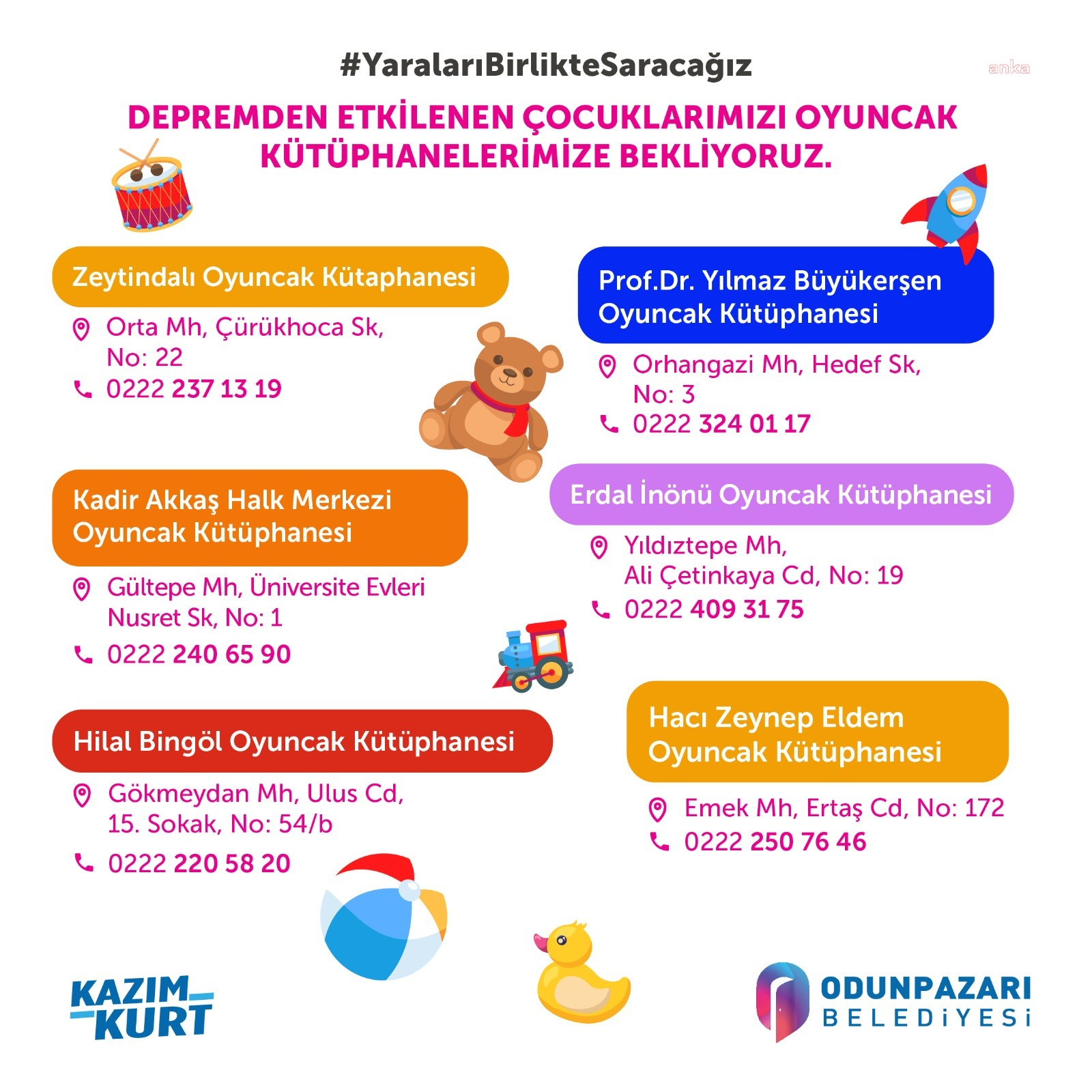 Önceliğin her zaman çocuklar olduğunu söyleyen Odunpazarı Belediye Başkanı Kazım Kurt, “Eskişehir’e gelen depremzede ailelerin çocukları için oyun kütüphanelerimizi açtık. Çocuklarımız öğretmenlerimiz eşliğinde akranlarıyla buluşacak, oyunlar oynayacak.”