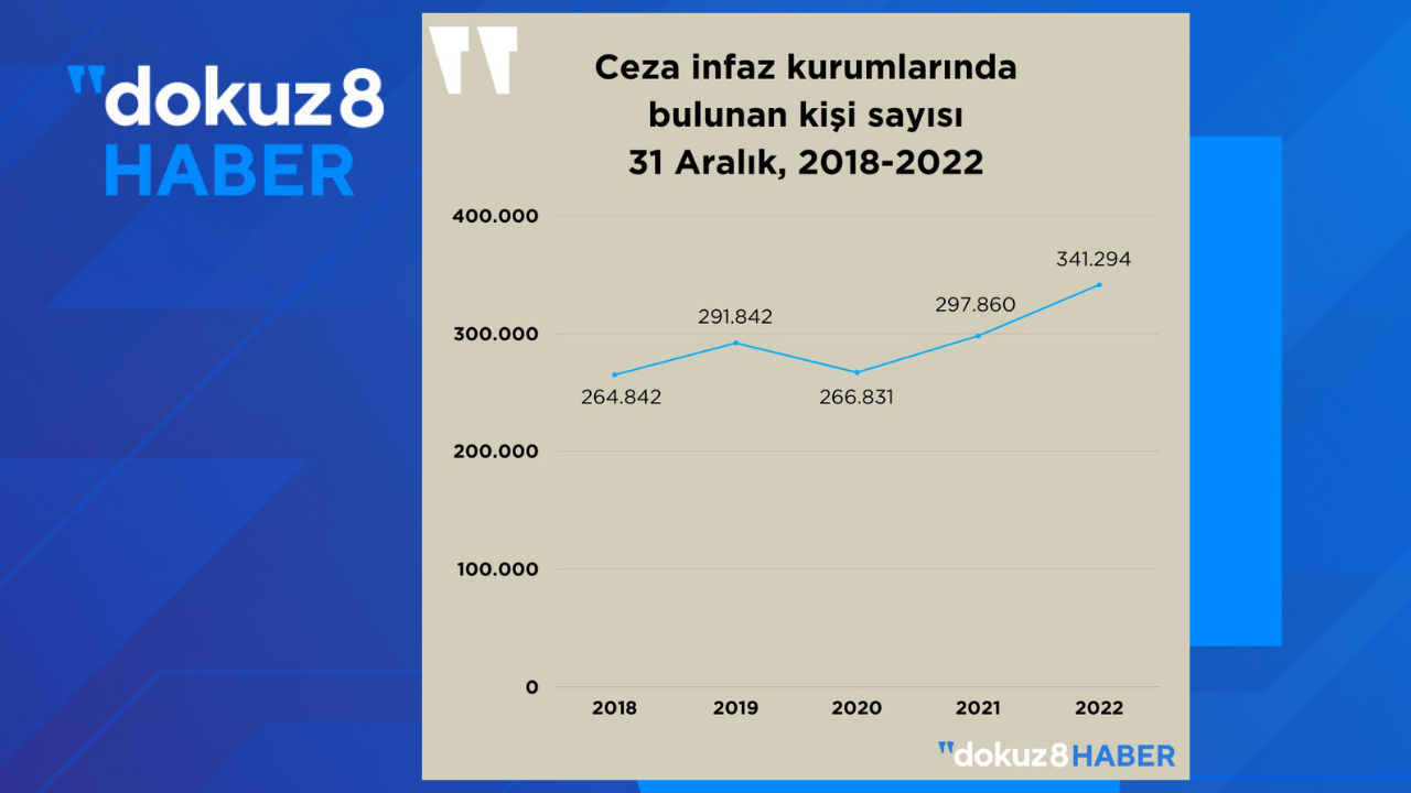 İzinli olanlar da dâhil olmak üzere ceza infaz kurumlarında 31 Aralık 2022 tarihindeki kayıtlı kişi sayısı, 2021 yılının aynı tarihine göre %14,6 artarak 341 bin 294 oldu. 2020 Af Yasasından sonra ise 291.842 binden 266.831 bine düştü.