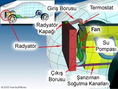 su soğutmalı bir motorun soğutma sistemi; Motor su kanalları, termostat, su pompası, radyatör ve kaput, elektrikli fan veya kayış, hortumlar, ısıtma soğutma sıvısı ve genleşme kabından oluşur. Yakıt yakan motorlar büyük miktarda ısı açığa çıkarır. Egzoz sistemi ısının çoğunu alır, ancak motorun silindir duvarları, pistonlar ve silindir kafası gibi parçaları da büyük miktarda ısıyı emer. Motorun bir parçası çok ısınırsa, yağ filminin koruma özelliği olmaz ve yağın olmaması motora büyük zararlar verebilir. Öte yandan motor düşük sıcaklıklarda çalışıyorsa hiç verim almayacak, yağ kirlenecek, tortu oluşacak ve yakıt tüketimi artacaktır. Bu nedenle motor sıcaklığı yükselene kadar soğutma sistemi devreye girmeyecek şekilde tasarlanmıştır.