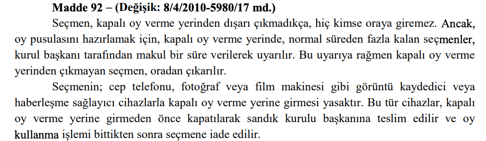 Bu çözümlerin işinize yaramayacağını düşünüyorsanız, siz oy kullanmaya giderken sandık görevlilerinin görebilmesi için telefonunuzu tutarak geçici olarak telefonunuza el koyabilirsiniz. 298 Sayılı Seçimlerin Temel Hükümleri ve Seçmen Kütükleri Hakkında Kanun’un 92. maddesine göre kapalı oy kullanma salonuna telefon, kamera gibi cihazlar getirilemez ve oy verme işlemi bitene kadar telefonunuza el konulur.