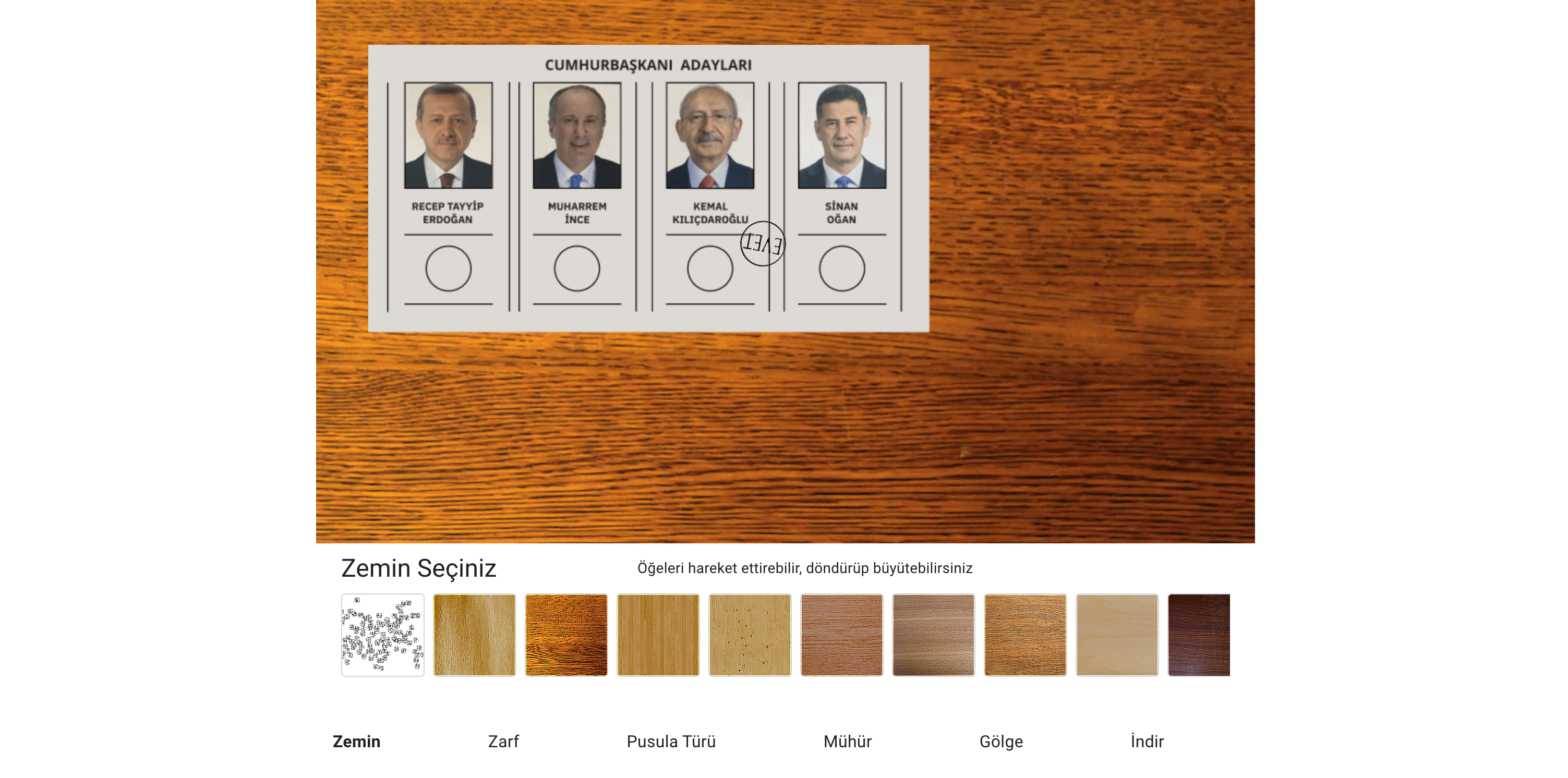 Bu adresten ulaşabileceğiniz pusula oluşturma uygulaması sayesinde pusula üzerinde herhangi bir adaya evet damgası vurabilir, pusulanın daha gerçekçi görünmesi için zarflar ve gölgeler ekleyebilirsiniz.