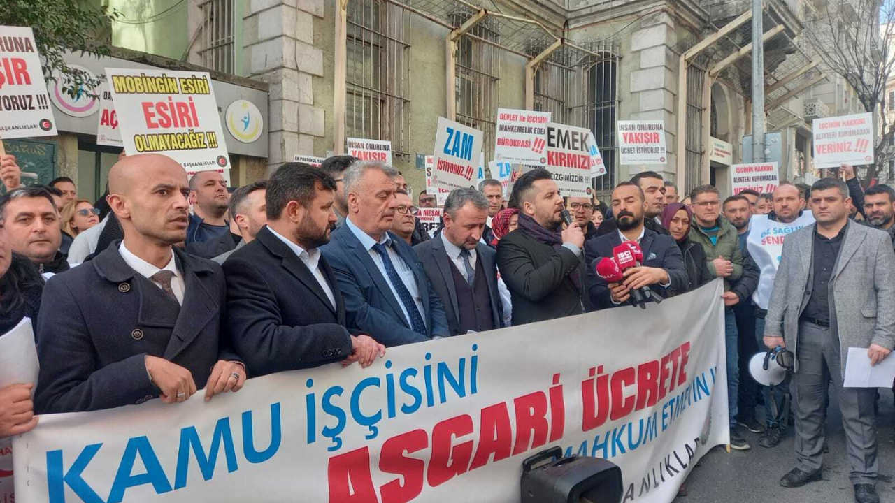 Hak-İş Federasyonu’na bağlı Öz-Sajlık-İş Federasyonu üyeleri, Fatih’te bulunan İstanbul İl Aile ve Sosyal Hizmetler İdaresi binası önünde açıklama yaptı. “Kamu çalışanını asgari ücretle yargılamayın” pankartı açan sağlık çalışanları, “Ücret adaleti istiyoruz, işçi zulmünü istemiyoruz” yazılı pankart açtı.