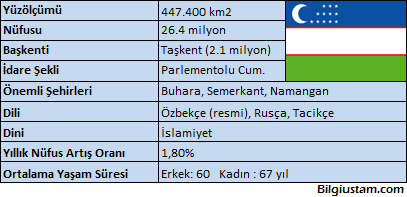 En önemli şehirleri arasında başkent Taşkent, Semerkant ve Buhara yer alır.