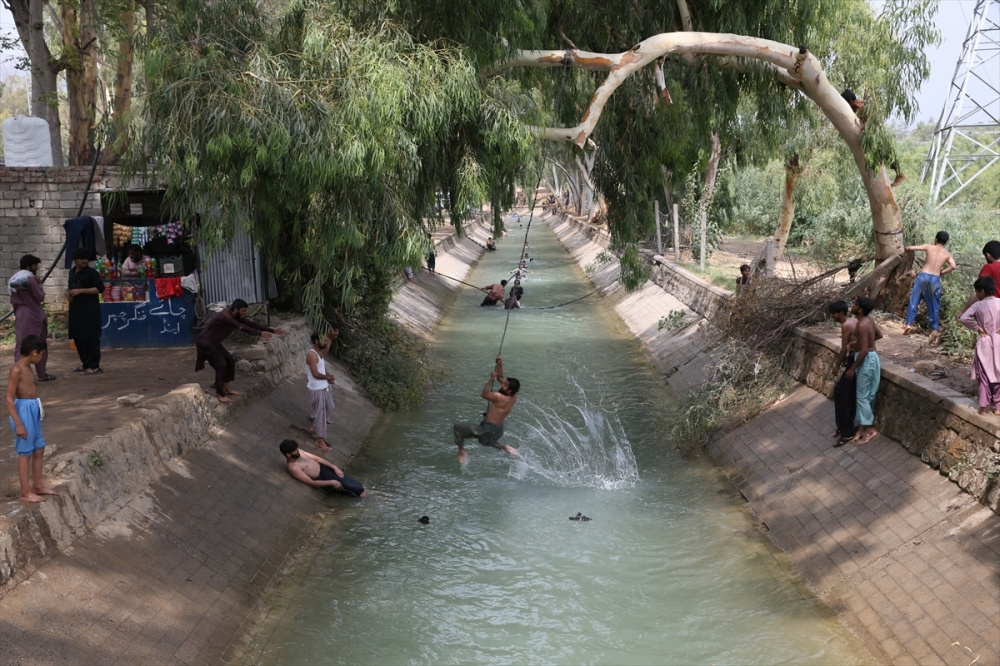 İslamabad yakınlarındaki Texila ilçesinde sıcak havadan korunmak isteyen onlarca kişi sulama kanalında serinledi.