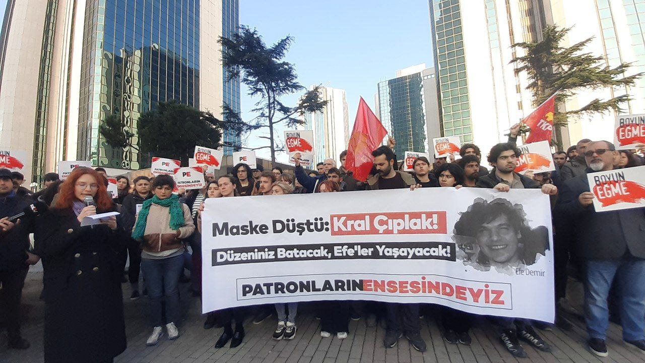 TKP, Levent’te Yapı Kredi genel müdürlük binası önünde “Efe Demir’den hesap soracağız” sloganıyla toplanan Patronlar Bankası işçi dayanışma ağının boynundayız.