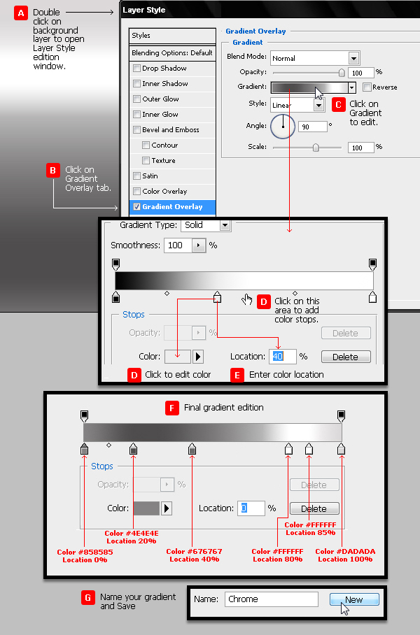 600 x 450 piksel boyutlarında, RGB renkli, 72 dpi kalitesinde ve şeffaf bir Photoshop çalışma alanı oluşturuyoruz. Yeni bir katman oluşturalım ve siyaha boyayalım. Bu katmana çift tıklayarak blending seçeneklerini açalım. Gradient Overlay seçeneğini aktif edin ve aşağıdaki ayarları uygulayın;