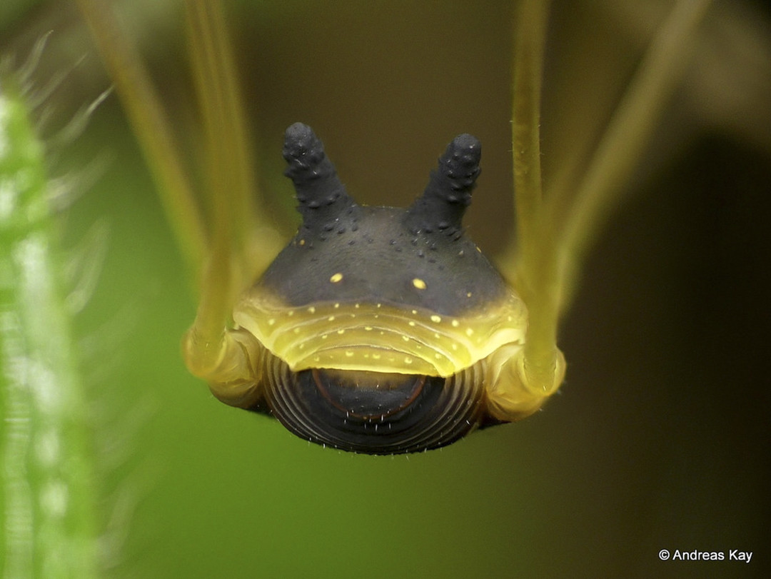 İlk izlenimi sarsacak kadar ilginç! Resme ilk kez bakan bazı kişiler çok sevimli bulurken bazıları da ürkütücü buluyor. baktığınızda; 8 uzun sarı bacakları vardır. Uzun bacaklarının üzerinde siyah bir köpeğin kafası belirir. Başının üstünde tavşan kulakları var. Kafasındaki sarı noktalar gözlerine benzese de sadece sarı noktalardır. Temelde gözleri bu lekelerin altında siyah noktalardır. Bu ilginç görüntünün nedeni. Anderson-Kay ve diğerlerine göre, onu potansiyel av olarak gören düşmanlara karşı heybetli bir görünüm vermek için. Çünkü bu sevimli eklembacaklılar baş parmak büyüklüğündedir ve savunma mekanizmalarında zehir yoktur. Beslenme ihtiyacını avlanarak değil, avlanan hayvanların bıraktığı leşleri yiyerek karşılar.