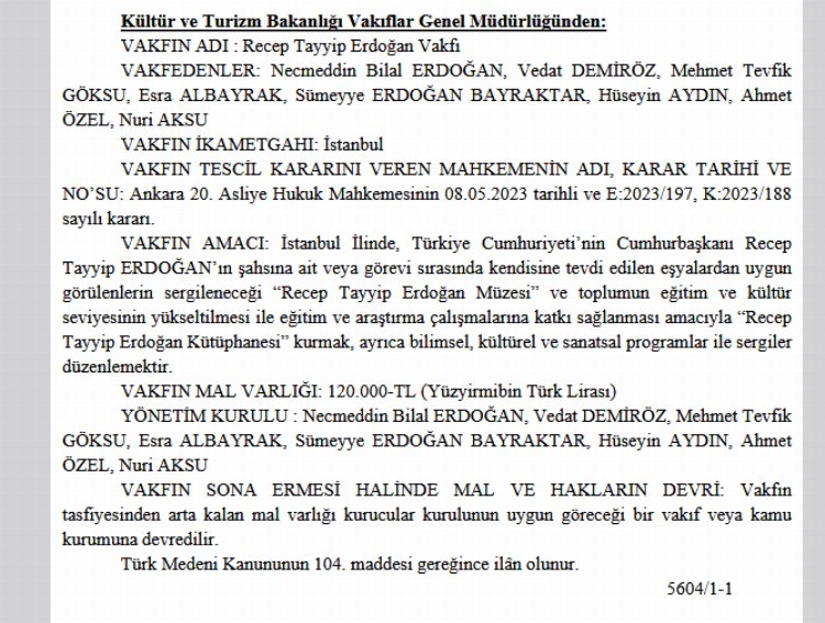 Vakıflar Genel Müdürlüğü’nün Resmi Gazete’de yayımladığı duyuruda, Recep Tayyip Erdoğan Vakfı’nın mal varlığının 120 bin lira olduğu belirtilirken, “Vakfın feshi halinde kalan mal varlığı bir vakfa devredilir. veya Kurucular Meclisinin uygun göreceği bir kamu vakfı.” Yargı dahil.