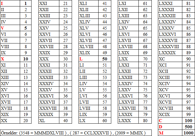 - Karakterin sağında daha düşük değerli bir karakter görünüyorsa çoğul olarak okunur. XI = 11, DCX = 610, LXXVII = 77 olarak.