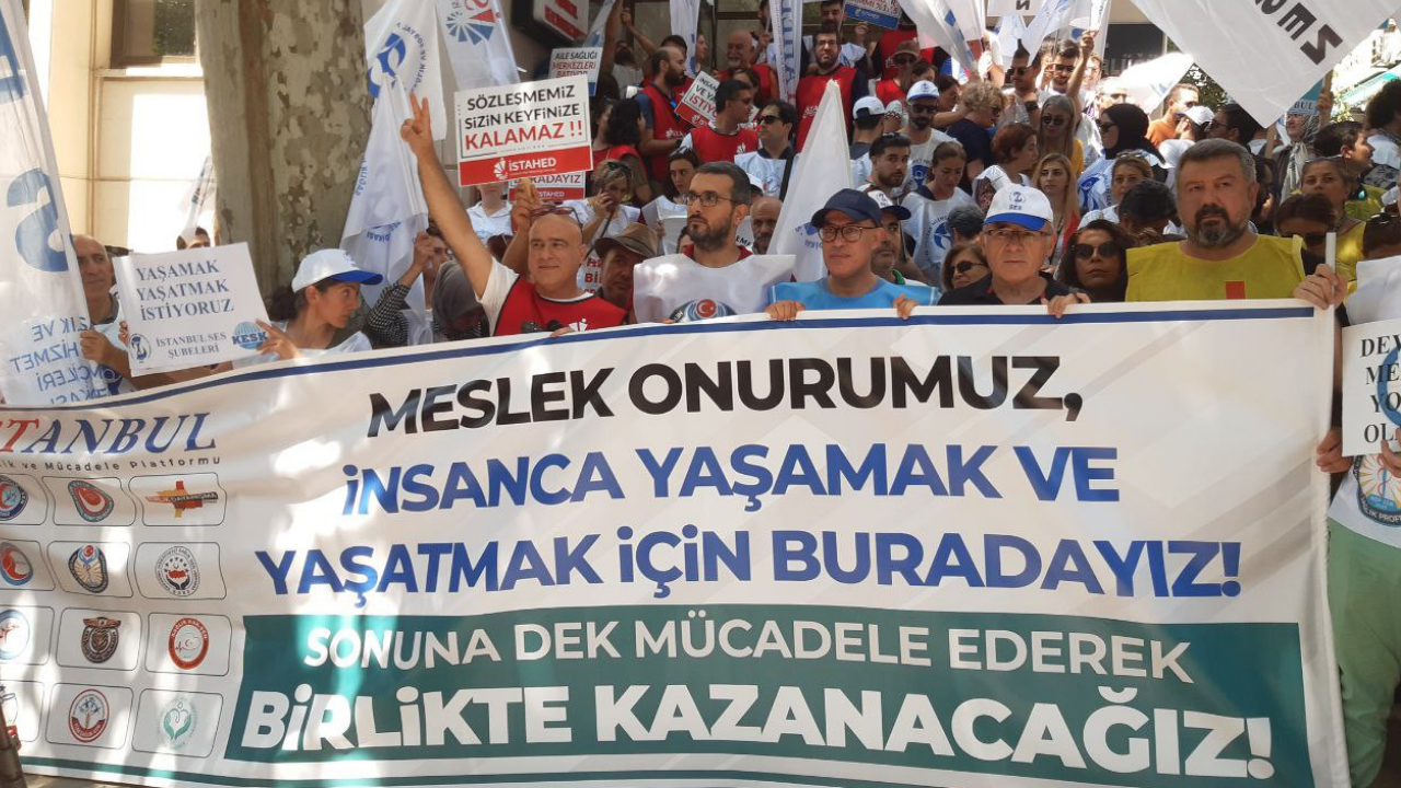 Sağlık emekçileri kamu TİS görüşmelerinin başladığı bugün iş bıraktı. İstanbul İl Sağlık Müdürlüğü önünde basın açıklaması düzenledi.