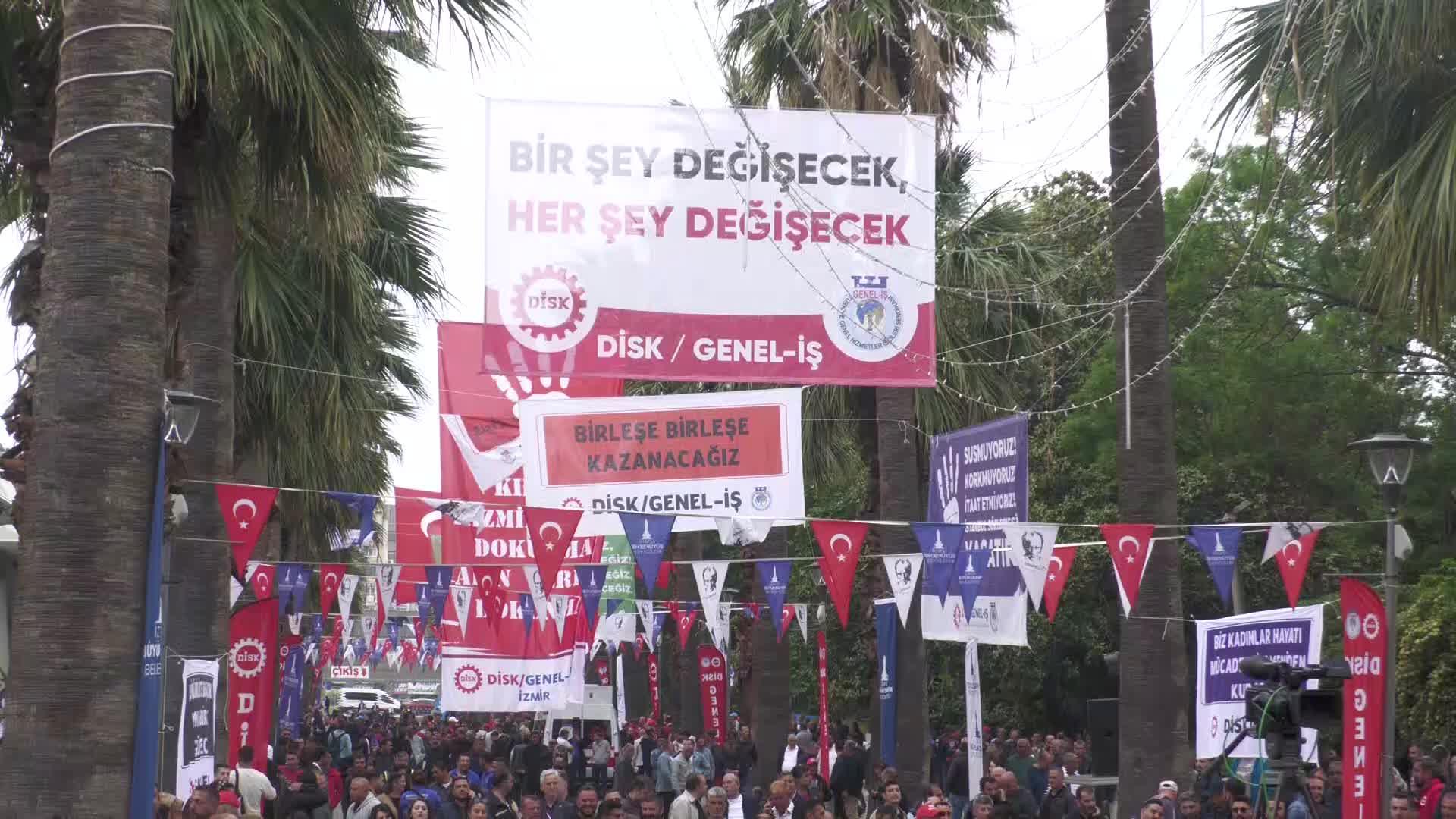 Kültürpark’ta düzenlenen törene İzmir Büyükşehir Belediye Başkanı Tunç Soyer, CHP Grup Başkan Yardımcısı Özgür Özel, CHP Genel Başkan Yardımcısı Yüksel Taşkin, DİSK Başkanı Arzu Çerkizoğlu, İş Genel Konfederasyonu Başkanı Ramzi Chaliskan, milletvekili adayları, sendika katıldı. temsilciler ve işçiler.