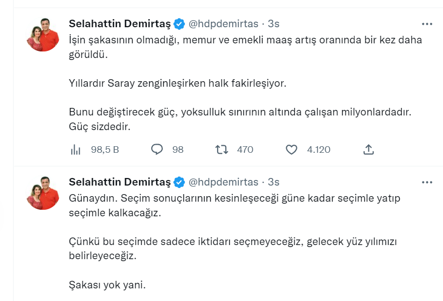 Edirne F Cezaevi’nde tutuklu bulunan Halkların Demokratik Partisi (HDP) eski Eş Genel Başkanı Selahattin Demirtaş, memur ve emekli maaşlarına yapılan zamlara sosyal medya hesabından yaptığı paylaşımla yanıt verdi.