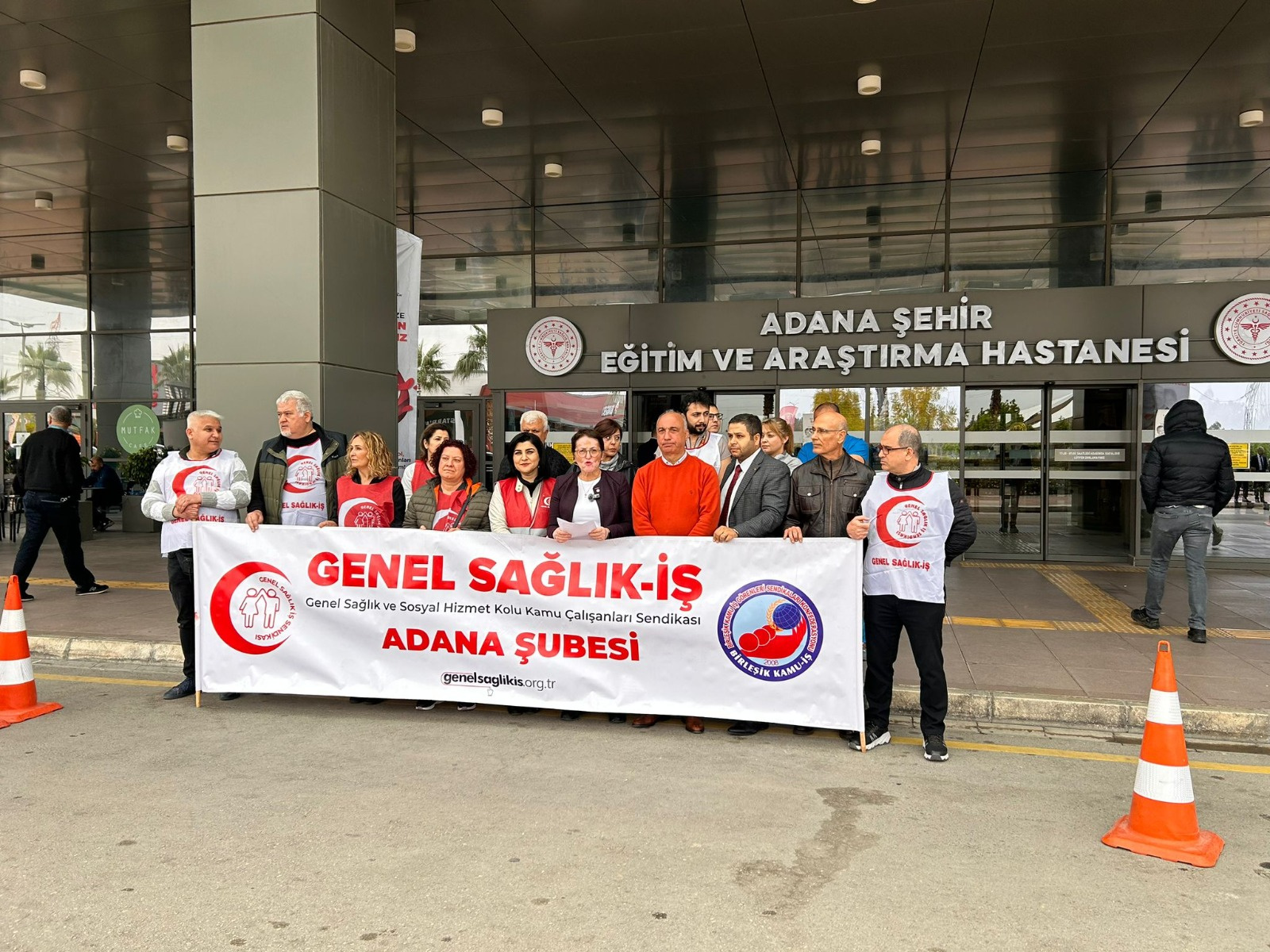 Bugün burada Adana Şehir Hastanesi Sağlık Bakım Hizmetleri Müdürünün baskılarını ve iftiralarını kabul etmediğimizi belirtmek için toplanmış bulunuyoruz ve kendisinin istifaya davet ediyoruz.