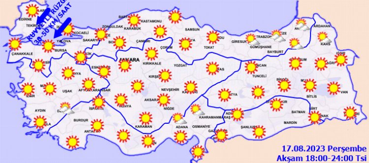 Genellikle kuzey, Akdeniz kıyıları ile güneydoğu kesimlerde batı ve güneybatı yönlerden hafif, ara sıra orta kuvvette esecek rüzgarın Marmara’da kuzey ve kuzeydoğu yönlerden kuvvetli olarak (30-60 km/saat) esmesi bekleniyor.