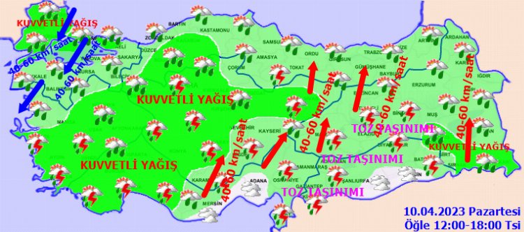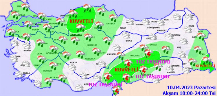Yurt genelinde yağmur bekleniyor. Güney kesimlerde sağanak ve gök gürültülü sağanak şeklinde beklenen yağış, Marmara, Orta Ege, Batı Akdeniz, Doğu Akdeniz, Orta Anadolu’nun kuzey ve batısı, Karadeniz’in batısı, Batı ve Güneydoğu Anadolu ile Güneydoğu Anadolu’da yerel olacak. Güçlü olması bekleniyor. Doğu Akdeniz ve Güneydoğu Anadolu’da toz taşınımının ortaya çıkacağı tahmin ediliyor.