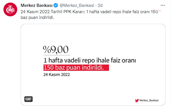 asistan. Dr. Oğuz Demir: Merkez Bankası faizi 150 puan indirdi. Politika faizi yüzde 9 oldu. Kendi içinde bir bilmece oluşturduğu düşünülen açıklama metnindeki cümle aslında boş: PPK, nakit transfer mekanizmasının etkinliğini desteklemek için araçlarını kullanmaya ve ek önlemler almaya devam edecek. Uygulanacak politikalar Aralık ayında açıklanacaktır.