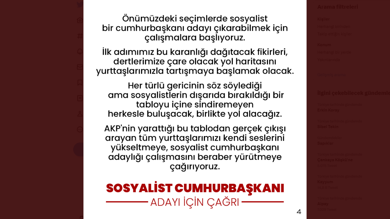 Cumhurbaşkanlığı ve milletvekilliği seçimleri için 14 Mayıs tarihi belirlenirken, bini aşkın imzayla yayınlanan “Sosyalist Cumhurbaşkanı Adayı Çağrısı” metninde sosyalist cumhurbaşkanı adayı için göreve başlanılacağı duyuruldu. İnsanlar.