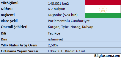 Başkent Duşanbe. Tacikler ülke nüfusunun yarısından fazlasını oluşturuyor. Diğer kısım ise Özbekler, Ruslar, Tatarlar ve diğerlerinden oluşuyor.