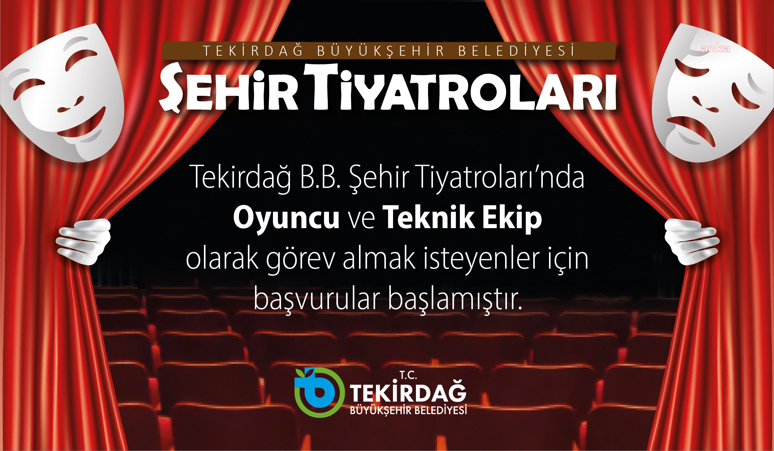 Tekirdağ Belediyesi Şehir Tiyatrolarına oyuncu ve teknik eleman olarak katılmak isteyenler, kadro alımı ile ilgili gerekli bilgilere “www.tiyatro.tekirdag.bel.tr” internet adresinden ulaşabilirler.
