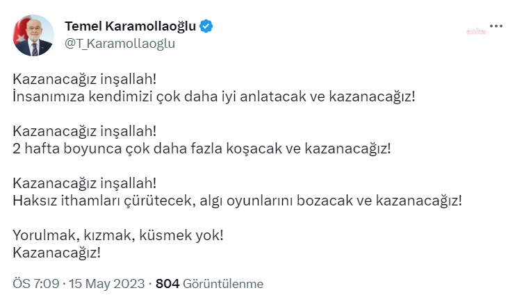 Saadet Partisi Genel Başkanı Temel Karamolaoğlu, Twitter hesabı üzerinden; “İnşallah kazanırız. Halkımıza kendimizi çok daha iyi anlatacağız ve kazanacağız. İnşallah kazanırız. İki hafta bol bol koşarak kazanacağız. İnşallah kazanırız. Haksız ithamları çürüteceğiz, ortalığı kıracağız.” Algı oyunları ve kazan. Yorulma, kızma, küsme” dedi.