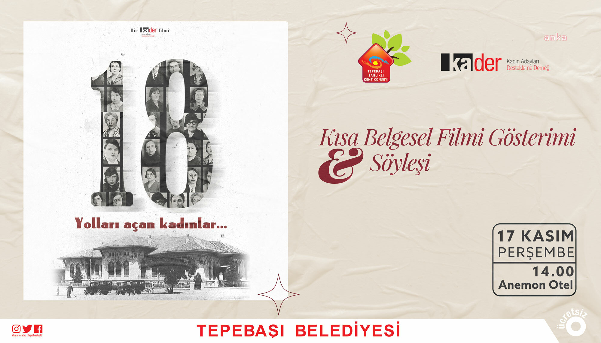 Tepebaşı Sağlık Kent Konseyi ve KA-DER işbirliğinde gerçekleştirilecek kısa belgeseller ve söyleşi sergisi 17 Kasım’da yapılacak. Türkiye Büyük Millet Meclisi’nin ilk kadın milletvekilleri, yapımcılığını KA-DER’in yaptığı “18 Yol Açan Kadınlar” belgesel filmi Eskişehirlilerle buluşacak. KA-DER Başkanı Nuray Karaoğlu’nun da katılacağı etkinlik 17 Kasım Perşembe günü saat 14.00’te Anemon Otel’de gerçekleşecek.
