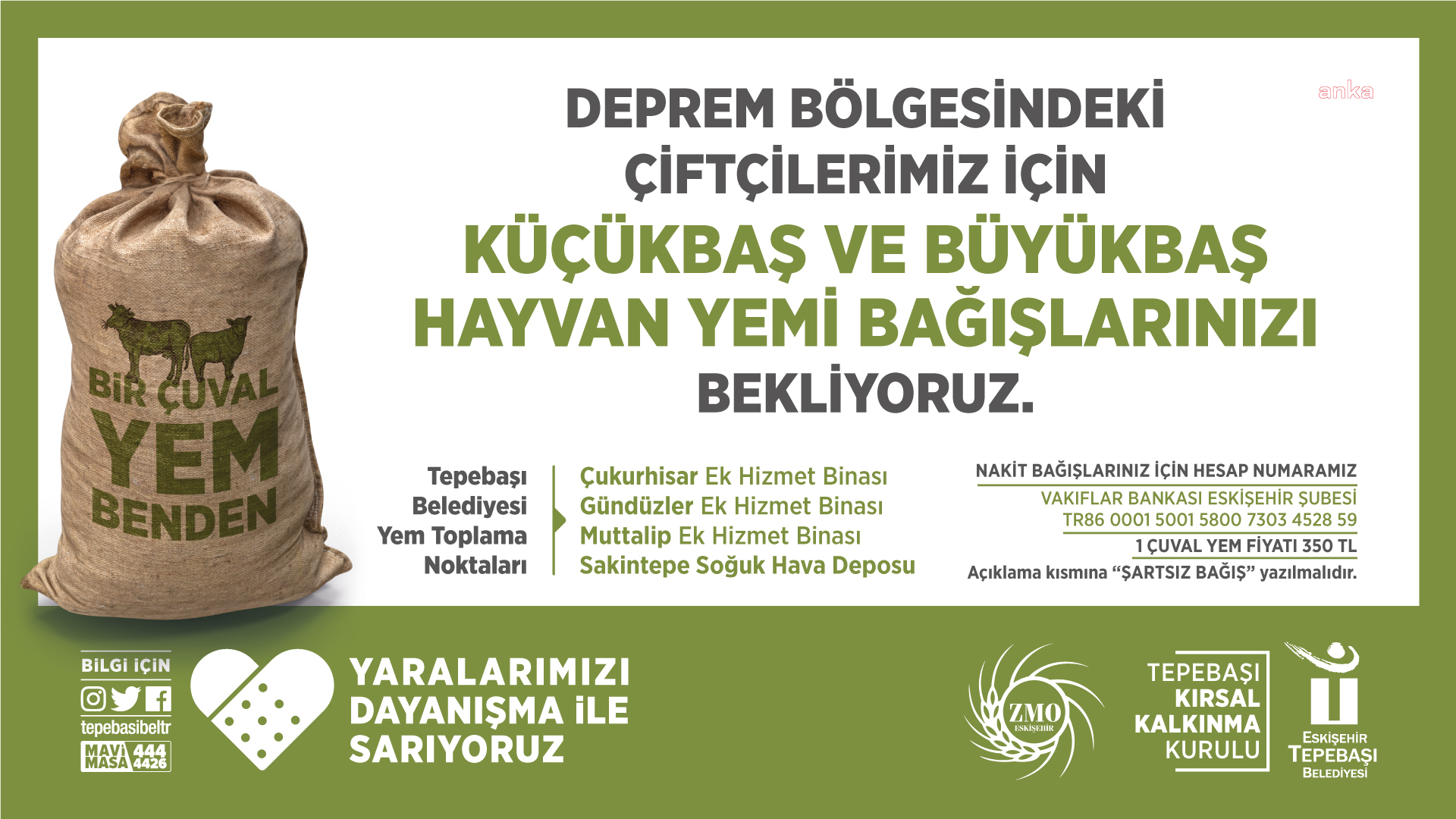 Tepbaşı Belediyesi, deprem bölgesindeki çiftçilere destek için “Yem Çuvalından Meni” kampanyası başlattı. Kampanya ile hayırseverler depremden etkilenen çiftçilere ayni ve nakdi yardımda bulunabilecek.