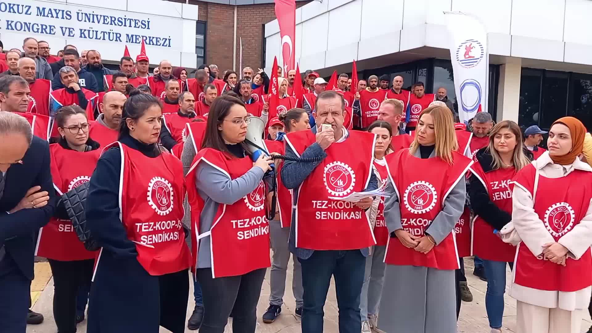 Yaklaşık 3 ay süren toplu iş sözleşmesi görüşmeleri anlaşmazlıkla sonuçlanırken, geçen hafta yaptıkları oylamada yüzde 82 oyla grev kararı alan OMÜ işçileri hazırlıklarını sürdürüyor. Bugün grev çadırı sürerken, OMÜ yetkilileri ve TÜHİS işveren sendikası masaya döndü. Onlar oturdular. Birlik yetkilileri aldıkları galibiyetle masadan kalktıklarını belirterek, OMÜ Kongre ve Kültür Merkezi önünde açıklamalarda bulundu. Tez-Koop-İş Sendikası Samsun Şube Başkanı Tarık Sayen şunları söyledi: