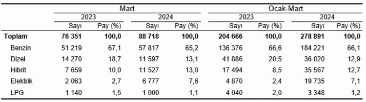 TÜİK’in Mart ayına ilişkin Motorlu Kara Taşıtları İstatistikleri’nde trafiğe kaydı yapılan taşıtların yüzde 45,5’ini motosiklet, yüzde 39,1’ini otomobil, yüzde 8,7’sini kamyonet, yüzde 3,8’ini traktör, yüzde 1,8’ini kamyon, yüzde 0,6’sını minibüs, yüzde 0,4’ünü otobüs ve yüzde 0,1’ini özel amaçlı taşıtlar oluşturdu.
