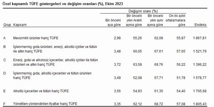 İşlenmemiş gıda ürünleri, enerji, alkollü içkiler ve tütün ile altın hariç TÜFE’deki değişim, 2023 yılı ekim ayında bir önceki aya göre yüzde 3,48, bir önceki yılın aralık ayına göre yüzde 60,05, bir önceki yılın aynı ayına göre yüzde 67,61 ve on iki aylık ortalamalara göre yüzde 57,65 olarak gerçekleşti.