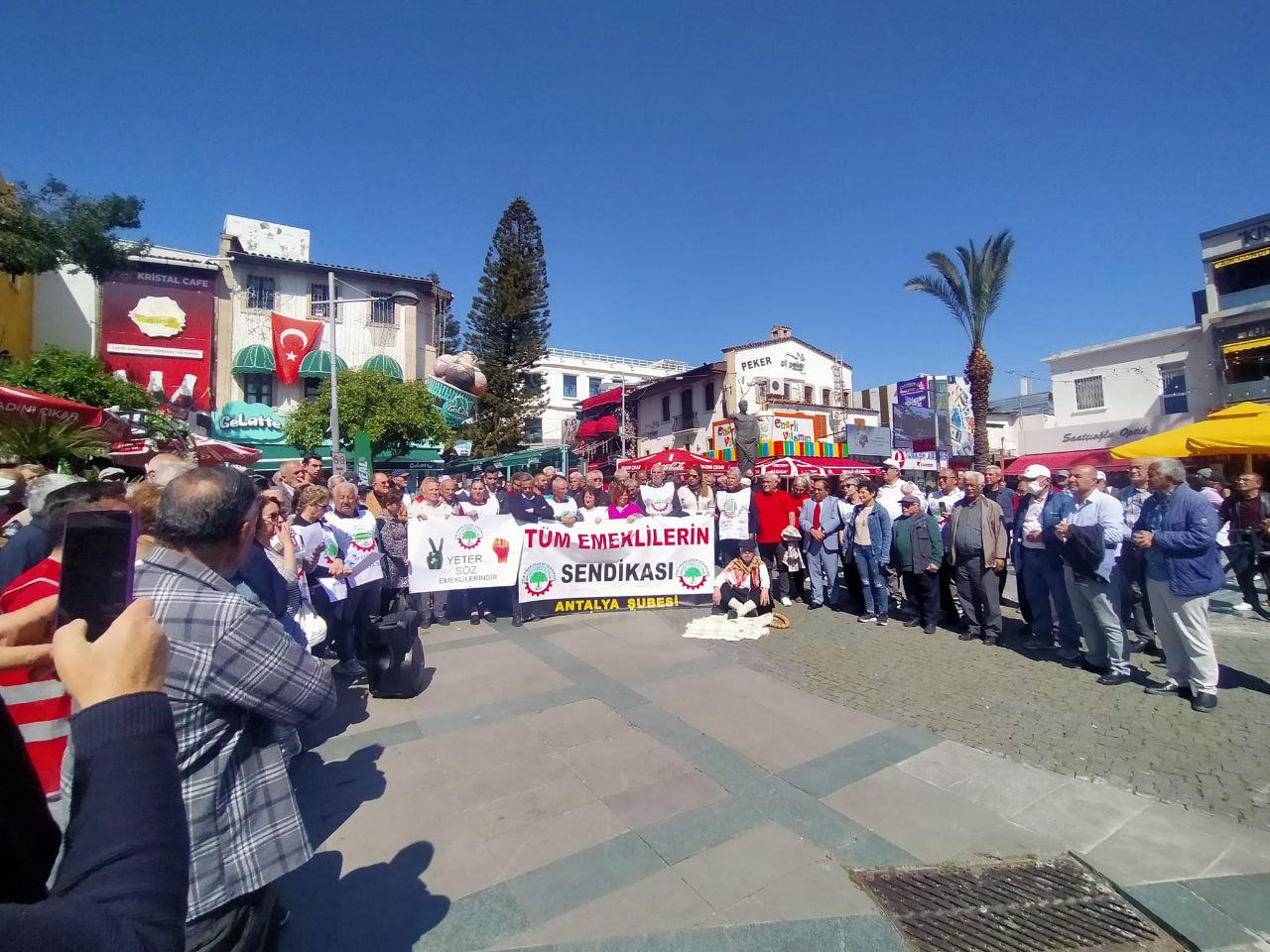 Tüm Emeklilerin Sendikası Antalya Şubesi Attalos Heykeli önünde basın açıklaması yaparak emeklilerin yaşadığı geçim sıkıntına dikkat çekti ve sorunlarına acil çözüm istedi. Tüm Emeklilerin Sendikası Antalya Şubesi adına konuşan Yönetim Kurulu Üyesi Oya Umur “Derin yoksulluk nedeniyle geleneklerimizi ve göreneklerimizi terk ettik. Emeklilerin tek gidebildiği yer, parklarda ki belediye bankları oldu. Boş bank bulan şanslı sayılıyor. Tabii hava soğuk veya yağışlı değilse…Emeklilerin kaliteli yaşlanmasının ölçütü, banklara hapsedilen bir yaşam oldu. Bu onur, bu iktidarındır” dedi