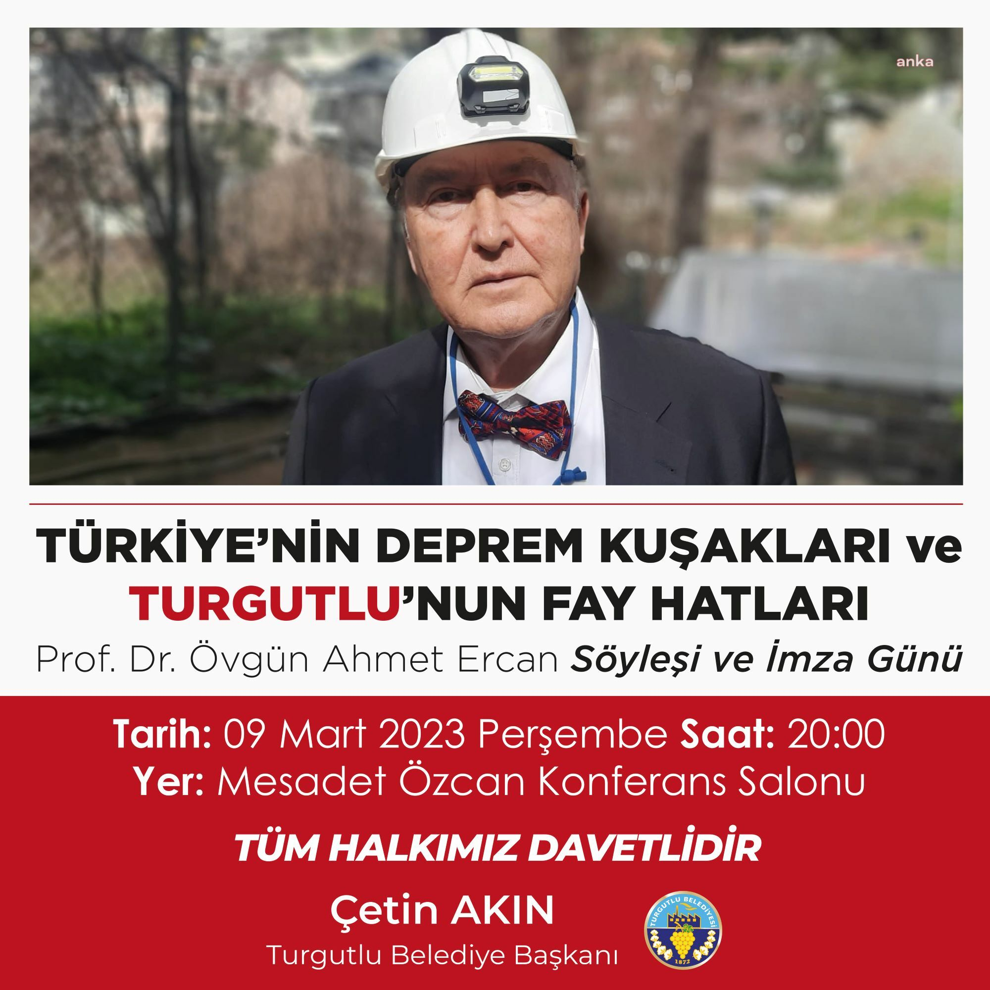 Kahramanmaraş’ta 6 Şubat’ta meydana gelen depremin ardından Turgutlu Belediyesi depremi bildirmeye devam ediyor. Bu kapsamda sismolog ve jeofizik mühendisi Prof. Dr. doktor. Övgün Ahmet Ercan, “Türkiye’de Deprem Bölgeleri ve Turgutlu Fay Hatları” konulu söyleşi ve imza oturumuyla Turgutlulularla buluşacak. Söyleşi 9 Mart Perşembe günü saat 20:00’de Messadet Özkan Kongre Salonu’nda gerçekleştirilecek.