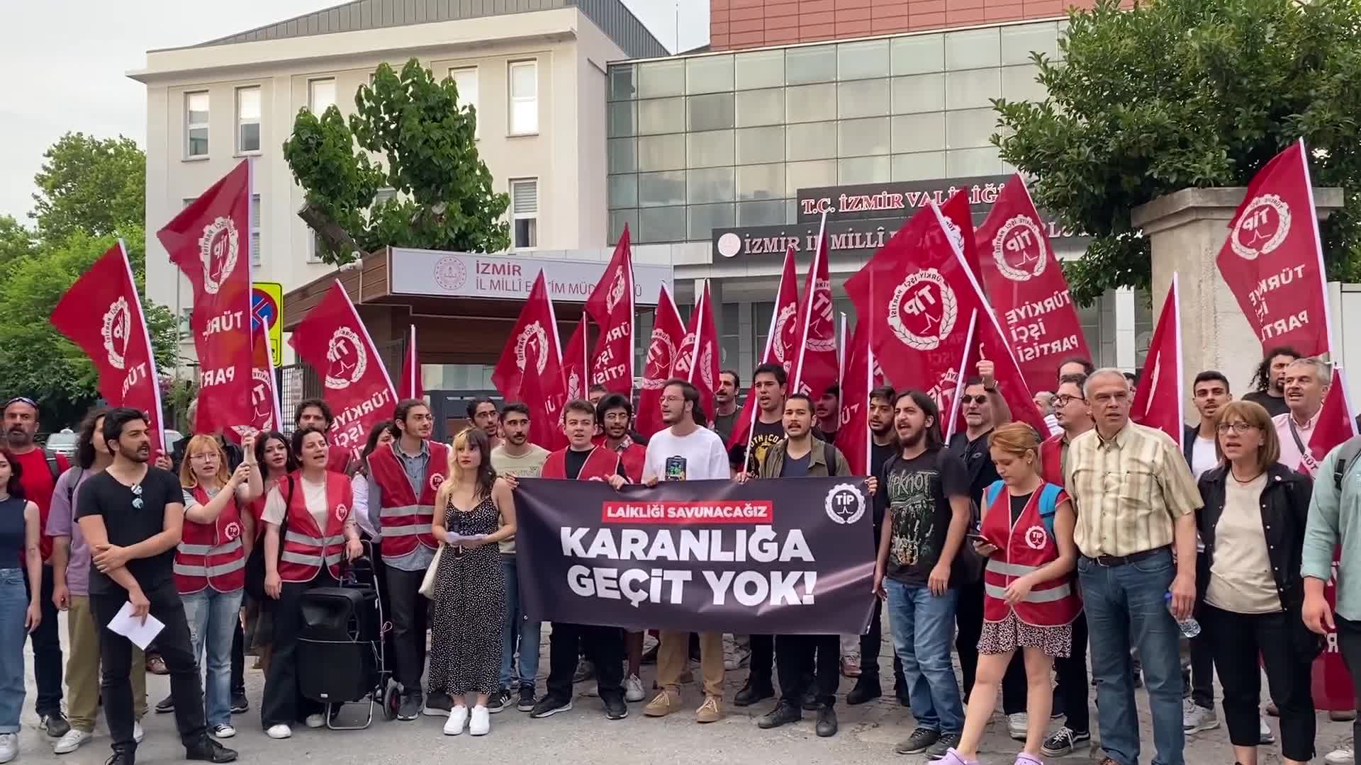 TİP İzmir İl Teşkilatı ve partililer, “Laikliği savunacağız. Karanlığa koridor yok” yazılı pankart açarak, İzmir İl Milli Eğitim Müdürlüğü önünde düzenlediği basın açıklamasında, “Eşittir, ilmi.” , laik eğitim, “karanlığa teslim olmayacağız”, “okullarda imam istemiyoruz.” Grup adına açıklamayı TİP İzmir Gençlik Sekreteri Baran Köseoğlu okudu.