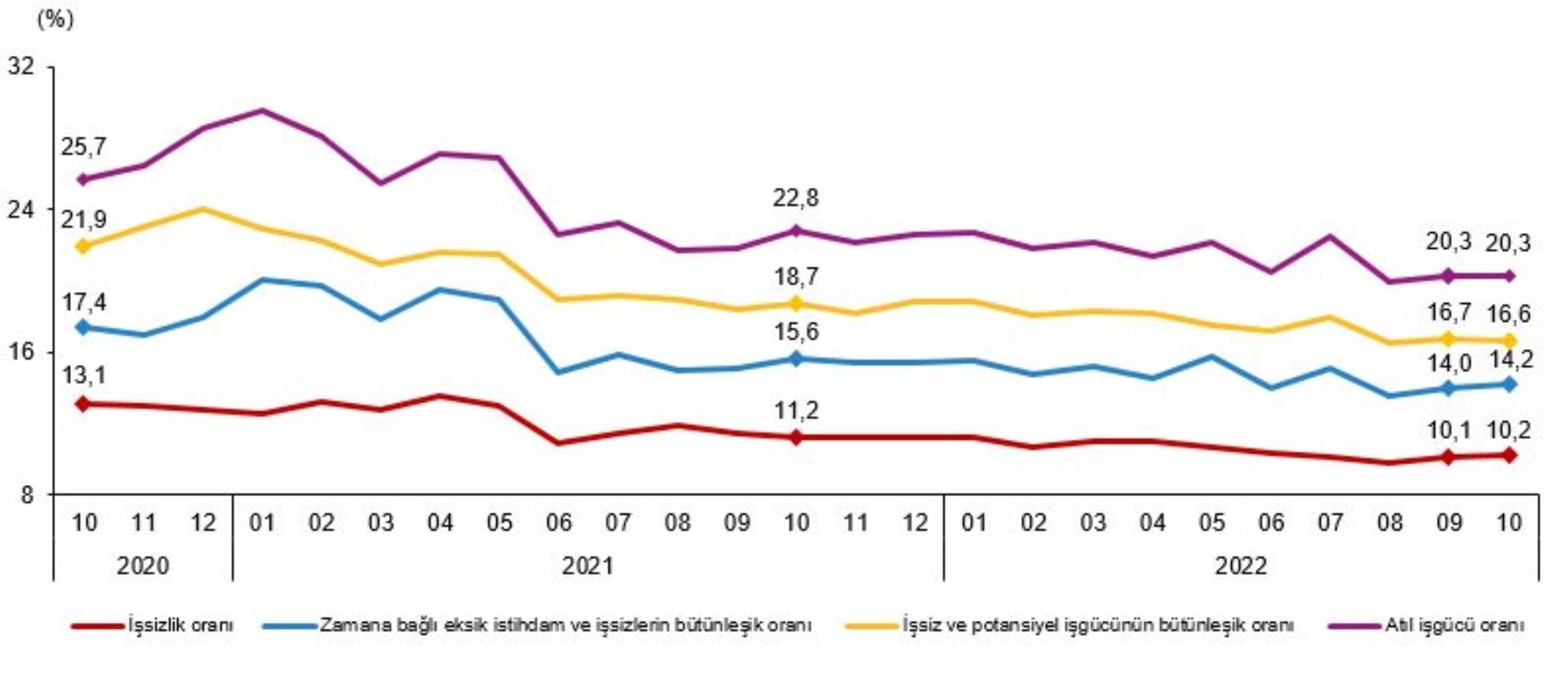 Zamana bağlı eksik istihdam, potansiyel işgücü ve işsizlerden oluşan işsizlik işgücü oranı 2022 Ekim ayında bir önceki aya göre değişmeyerek %20,3’te kaldı. Zamanla ilgili eksik istihdam ve işsizlerin birleşik oranı yüzde 14,2 iken, potansiyel istihdam ve işsizlerin birleşik oranı yüzde 16,6 olarak tahmin edildi.