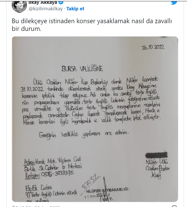 Sanatçı İlkay Akkaya’nın Başkan Nilüfer Olku Okaklari adıyla Bursa Valiliği’ne verdiği dilekçede, “Ülkü Okaklari Meclisi Nilüfer Mahalle Başkanlığı olarak aşağıdaki sanatçının konserinin iptalini talep ediyoruz. 31.10.2022 tarihinde Nilüfer ilçesinde gerçekleştirilecek olan İlkay Akkaya, adı geçen bu sanatçının terör örgütü mensubu olduğunu ve şehit olan terör örgütünün mensuplarını anmak için fotoğraflarını paylaşarak, valiliğini de yapmıştır. Ceyhan, Mardin ve Mersin’de verilecek konseri bölge ve valilik iptal etti.