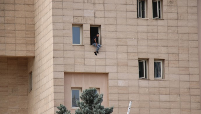 Urfa adliyesinin üçüncü katındaki pencereye çıkan genç intihara teşebbüs etti. Polis ve itfaiye ekipleri olay yerine sevk edilirken pencereye çıkan genç, “Kaymakam gelene kadar aşağı inmeyeceğim. Kaç defa öne çıktım? Artık son çarem bu. ”