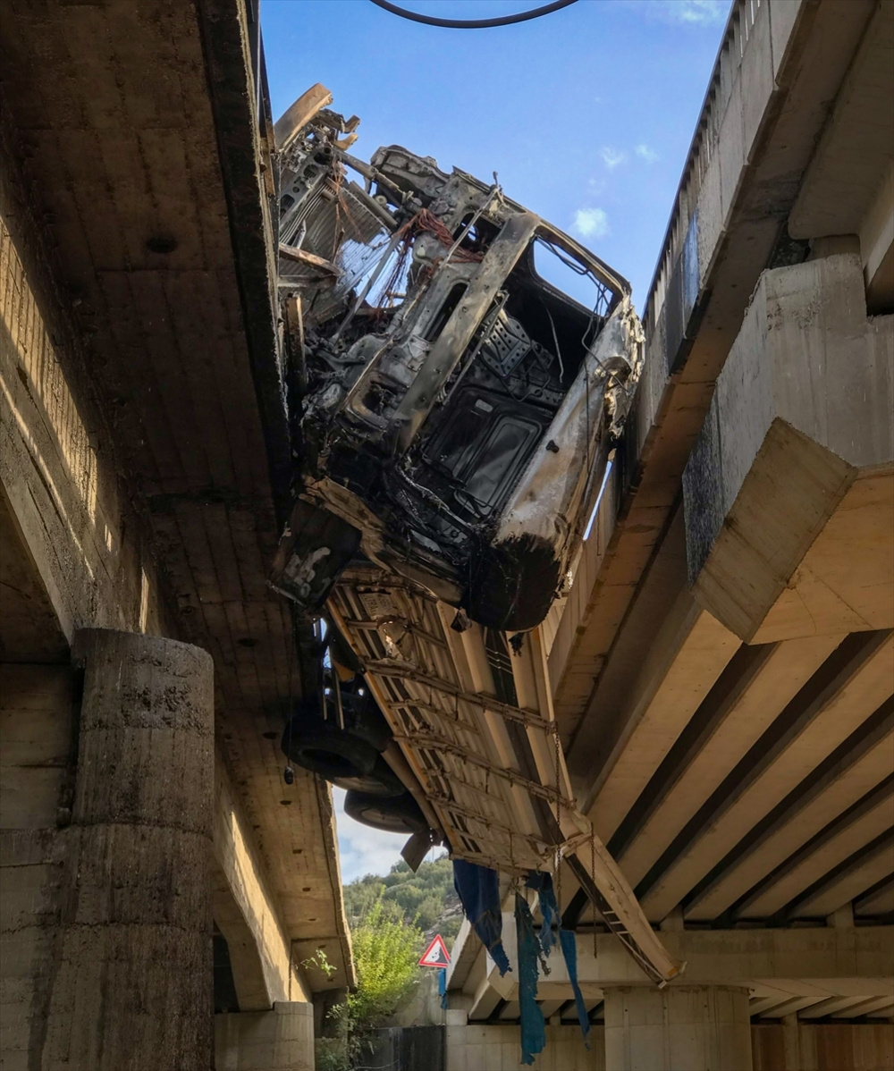 Ardından yan yana olan iki viyadük ortasındaki boşluğa devrilen tır burada sıkışıp alev aldı.